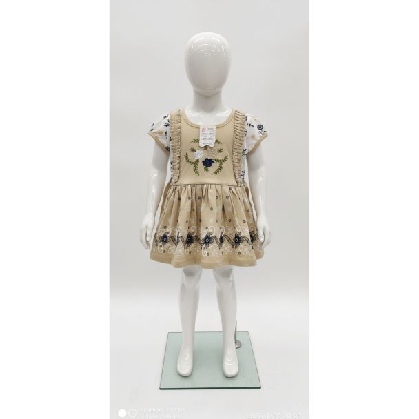 This adorable beige cotton dress is perfect for your little one. Designed with a charming floral pattern and a comfortable A-line silhouette, it's an ideal choice for everyday wear or special occasions. The dress combines style and comfort, making it a delightful addition to any child's wardrobe.