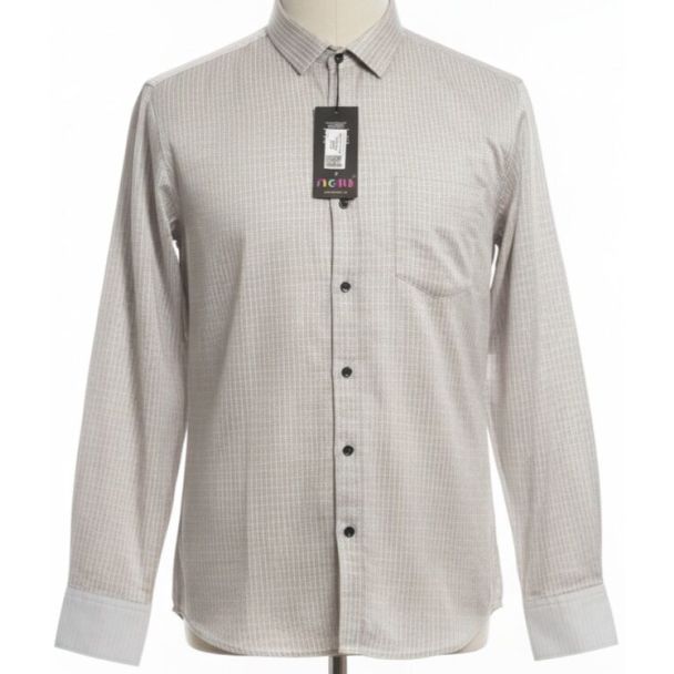 This semi-formal shirt is crafted from a comfortable blend fabric in a light beige hue, defined by a subtle woven micro-grid pattern. It features a classic spread collar, full buttoned sleeves with contrast white cuffs, and dark buttons that offer a sharp contrast. Available at Gangavathiexports with exceptional quality and unbeatable pricing.