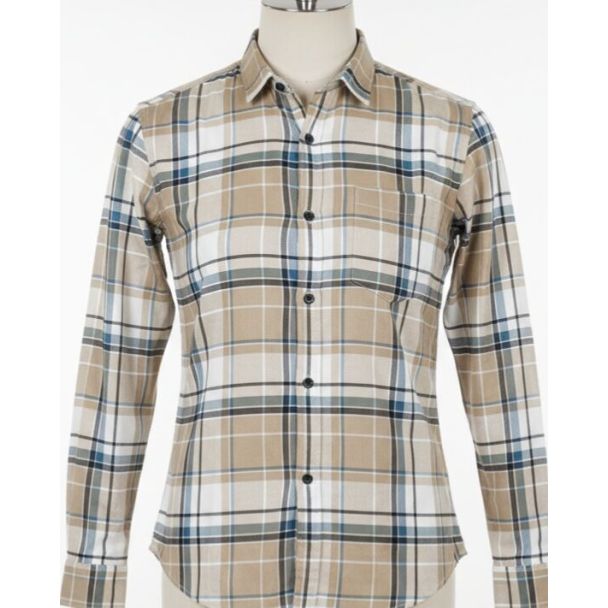 This shirt features a beige and white plaid pattern with hints of blue. It appears to be a cotton blend. The long sleeves end in a cuffed finish. The shirt has a classic collar and a pocket. The fit is a standard cut. Available at Gangavathiexports with exceptional quality and unbeatable pricing.
