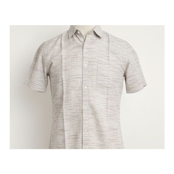 This shirt showcases a textured cotton fabric in a beige hue. It features a subtle, linear pattern running across the material. The short sleeves and classic collar provide a timeless appeal. The shirt offers a standard fit, with a button-down closure and a chest pocket. Available with exceptional quality and unbeatable pricing.