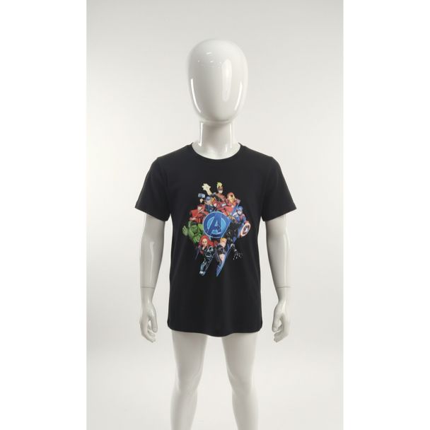This black kids' t-shirt is perfect for young superhero fans. Featuring a colorful graphic print of the Avengers team, this tee combines comfort and style for everyday adventures. The classic fit makes it a versatile addition to any child's wardrobe, ensuring they can show off their favorite characters with ease.