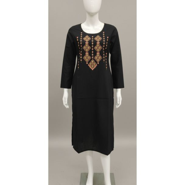 Why Buy This Product? This black cotton kurti offers a perfect blend of traditional craftsmanship and contemporary fashion. The high-quality cotton fabric ensures comfort, while the detailed geometric embroidery adds a fashionable flair. Its versatile design makes it a staple for any wardrobe, easily transitioning from day to night, and it's a budget-friendly choice for stylish ethnic wear.
