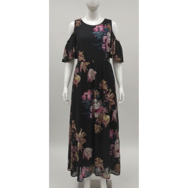 Make a stunning statement at your next party or special occasion with this elegant black maxi dress. Designed for the modern woman, it combines a flattering silhouette with a captivating floral print and chic cold-shoulder detailing, offering a perfect blend of style and comfort for mid-range fashion enthusiasts.