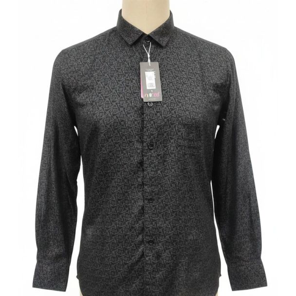 This shirt appears to be made of a smooth cotton fabric. It's a deep black color with a textured geometric pattern in a slightly lighter shade of grey. The shirt features full sleeves with buttoned cuffs and a classic collar. The fit appears to be a regular cut. Available with exceptional quality and unbeatable pricing at Gangavathiexports.