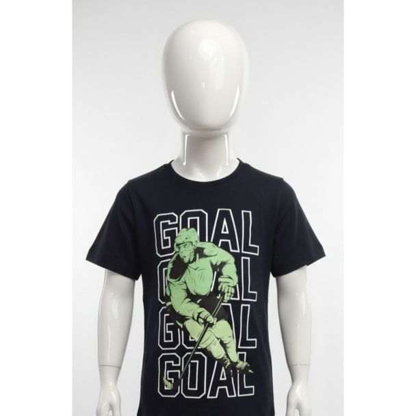 Black kids t-shirt featuring a green hockey player graphic and 'GOAL' text, short sleeves, and comfortable cotton fabric.