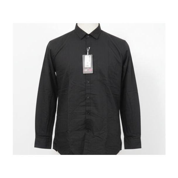 This shirt is crafted from a smooth, likely cotton blend fabric, in a solid black color. It has a classic collar and a button-down front closure. The sleeves are long, ending with a standard cuff. The shirt has a regular fit. Available at Gangavathiexports with exceptional quality and unbeatable pricing.