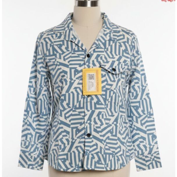 This cotton shirt features a busy, repeating geometric pattern composed of blue and off-white angular stripes. It has a relaxed collar, long sleeves with cuffs, and black contrast buttons down the front placket, along with twin chest pockets. Available at Gangavathiexports with exceptional quality and unbeatable pricing.