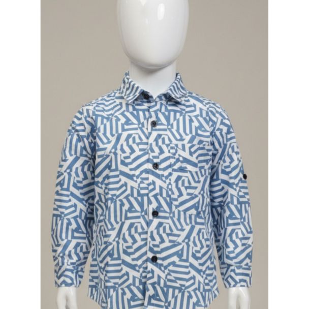 Boys Blue & White Geometric Pattern Cotton Shirt Full Sleeve