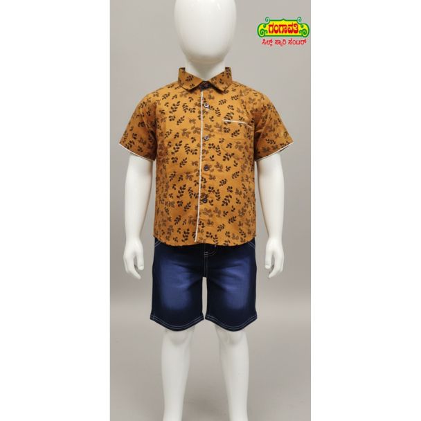 Boys Brown Leaf Print Cotton Shirt & Denim Shorts Set