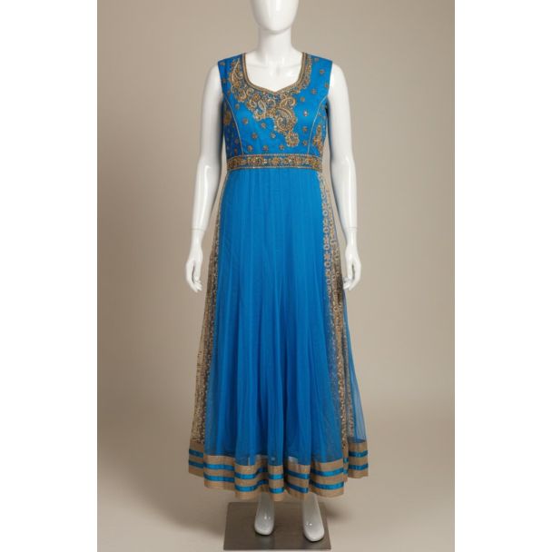 Bright Blue Gold Embroidered Sleeveless Anarkali Gown