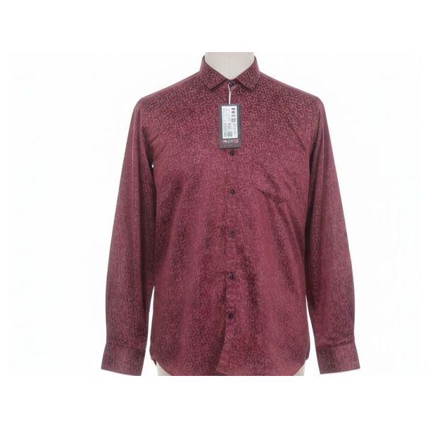 A burgundy button-up shirt featuring a subtle geometric pattern, long sleeves, and a classic collar style.