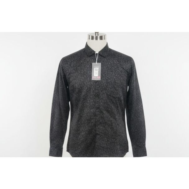A charcoal black patterned shirt featuring long sleeves and a classic collar. It offers a refined, sophisticated look.