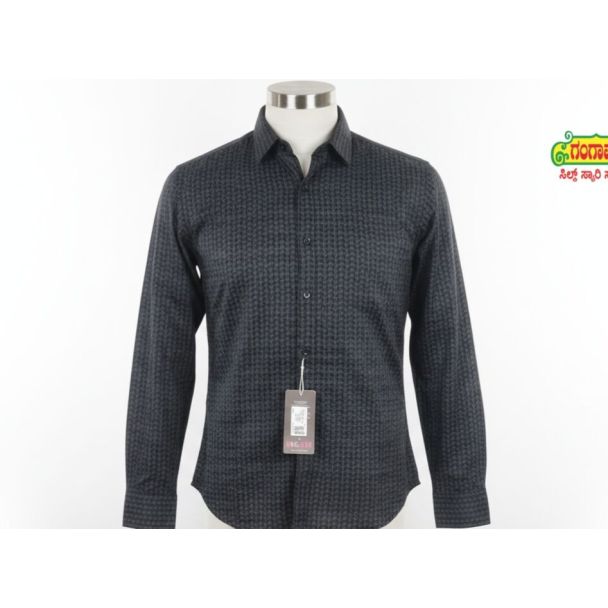 This shirt features a subtle geometric pattern in a charcoal grey color. The fabric appears to be a smooth, woven material. It has a classic collar and long sleeves. The shirt has a tailored fit. Available at Gangavathiexports with exceptional quality and unbeatable pricing.