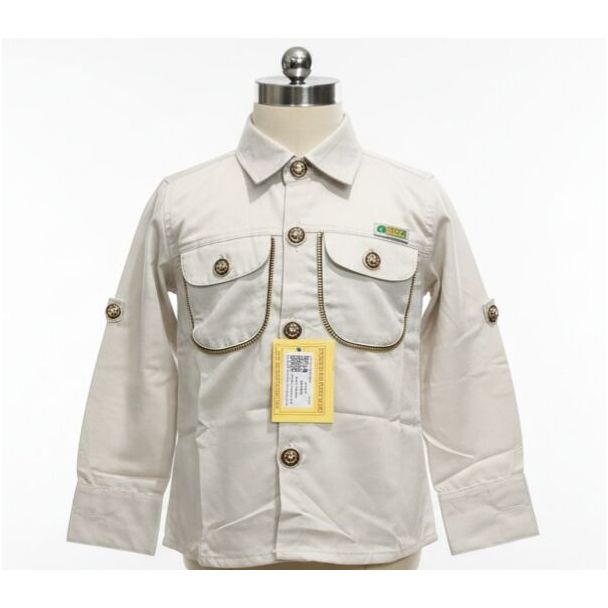 This shirt features a cream-colored, likely cotton fabric with a smooth texture. It has a classic collar and a button-down style. The sleeves are long, with buttoned cuffs. The shirt includes two front pockets with decorative zipper detailing and ornate buttons. Available at Gangavathiexports with exceptional quality and unbeatable pricing.