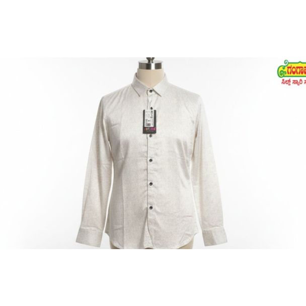 This shirt appears to be crafted from a cotton fabric with a slightly textured feel. The base color is cream, with a delicate dotted pattern in a darker, contrasting shade, possibly brown or grey. It has a classic collar and a button-down front. The sleeves are long and end in buttoned cuffs. The fit appears to be a regular, tailored silhouette. Available at Gangavathiexports with exceptional quality and unbeatable pricing.