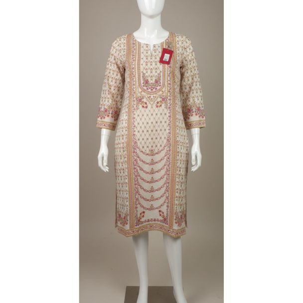 Elevate your wardrobe with this exquisite cream-colored kurti, designed for the modern woman who appreciates both style and comfort. This mid-range kurti is perfect for those who want a blend of traditional and contemporary elements. This kurti is suitable for various occasions, from casual outings to festive gatherings. This is a must have item for the seasons.