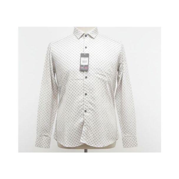 Cream colored long sleeve shirt featuring a subtle geometric pattern and classic button-up style.