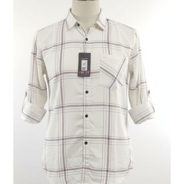This cream shirt is made from a breathable cotton fabric with a classic plaid pattern in muted grey and dark purple. It features a traditional collared neckline and a button-down front. The sleeves are full length with a roll-up tab for a versatile look. The fit is relaxed, and it includes a single chest pocket. Available at Gangavathiexports with exceptional quality and unbeatable pricing