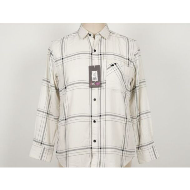 This shirt features a cream-colored fabric with a subtle plaid pattern in dark grey. The long sleeves have buttoned cuffs, and the shirt has a classic collar and a button-down closure. It has a relaxed fit with a single chest pocket. Available at Gangavathiexports with exceptional quality and unbeatable pricing.