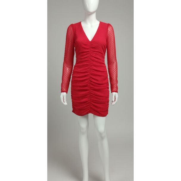 Crimson Red Ruched Bodycon Dress Long Sheer Sleeves