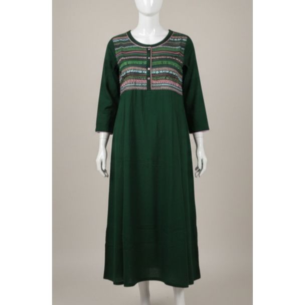 Elevate your daily and office attire with this sophisticated dark green A-line kurti. Designed for comfort and style, this piece expertly blends solid deep green fabric with a richly patterned yoke, making it ideal for professional settings across India. Its budget-friendly nature ensures great value without compromising on contemporary design.