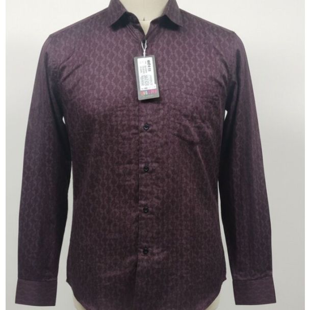 This dark maroon cotton shirt features a subtle patterned design, long sleeves, and a classic button-down style.