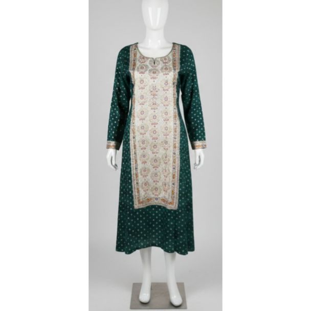 Why Buy This Product? This kurti delivers high-end style on a budget. The rich deep green color, combined with the detailed, eye-catching central panel, ensures you stand out. It’s versatile enough for multiple occasions while guaranteeing maximum comfort thanks to its relaxed A-line fit and soft material, making it a must-have ethnic staple.