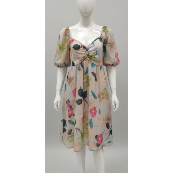 - Color: Cream base with a vibrant floral print featuring shades of pink, green, teal, and muted brown.