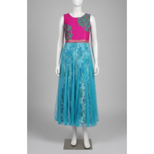 This striking sleeveless gown features a fuchsia pink bodice with intricate teal green floral embroidery and a round neckline. The waist is cinched with a gold and red striped band, flowing into a voluminous aqua blue net overlay skirt. Beneath, a light blue base fabric showcases a lush dark blue and green floral print. Available at Gangavathiexports with exceptional quality and unbeatable pricing.