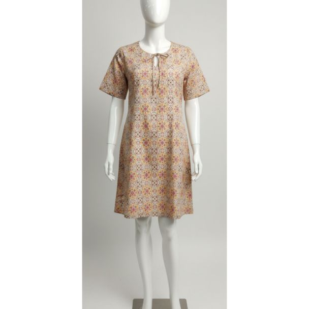 Elevate your wardrobe with this beautifully designed cotton A-line dress. Perfect for the modern woman, this dress seamlessly blends comfort and style. The warm, inviting color palette and the flattering A-line silhouette make it an excellent choice for a variety of occasions, from casual outings to stylish gatherings. This dress is designed to make you feel confident and chic, offering a perfect balance of elegance and ease.