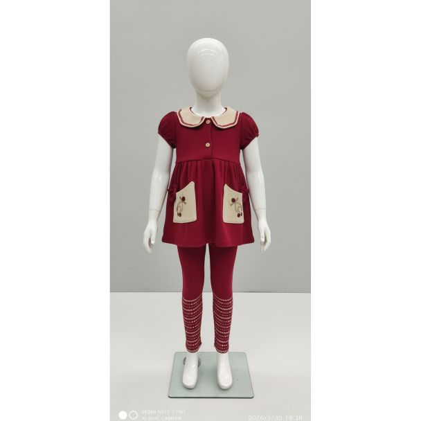 Girls Maroon Tunic Leggings Set Round Collar