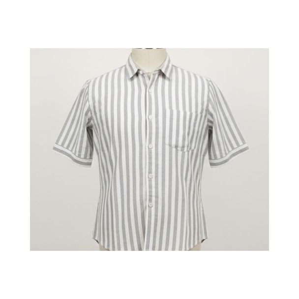 A classic gray and white striped shirt, crafted from a breathable fabric and featuring short sleeves and a collared neckline.