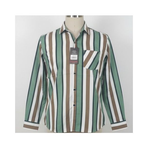 Stylish button-down shirt featuring vertical stripes in green, brown, and white. Long sleeves with a collared neckline. Perfect for casual wear.