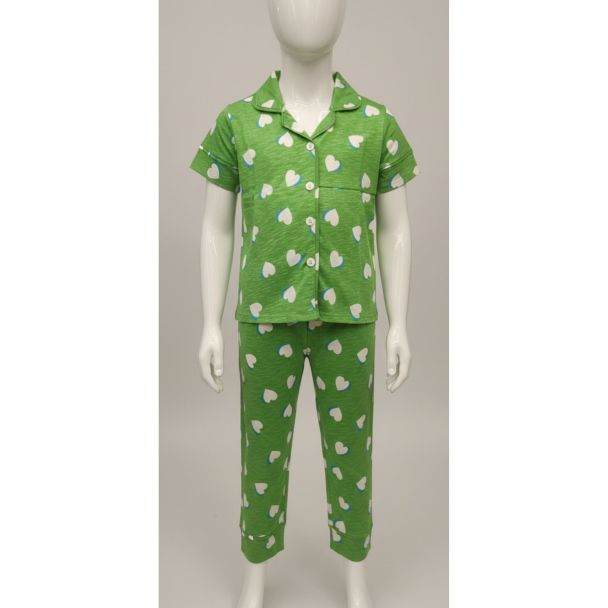 Introduce a touch of sweetness to bedtime with this charming green heart print cotton night suit set, designed specifically for girls. This mid-range night suit is perfect for a comfortable and cozy night's sleep, combining style and practicality effortlessly. The playful heart print adds a delightful touch, making it a favorite for young girls across India.