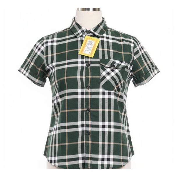 This shirt appears to be crafted from a cotton fabric. The predominant color is a deep green, accented by a plaid pattern in white and tan. It features short, cuffed sleeves and a classic collar. There is also a pocket on the chest. The shirt seems to have a standard, fitted silhouette. Available at Gangavathiexports with exceptional quality and unbeatable pricing.