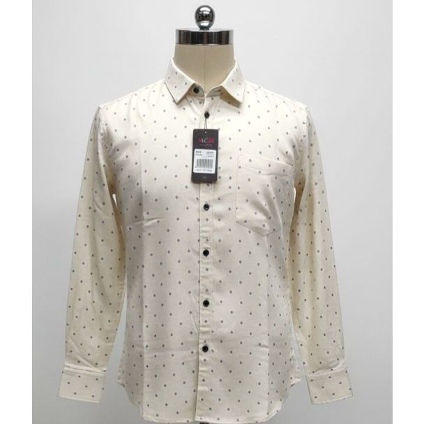 This ivory-colored shirt is crafted from comfortable cotton fabric, adorned with tiny geometric prints in a dark color, creating a subtle pattern. It features long sleeves with buttoned cuffs and a classic button-down style with a pointed collar. The shirt has a regular fit and a chest pocket on the left side. Available at Gangavathiexports with exceptional quality and unbeatable pricing.