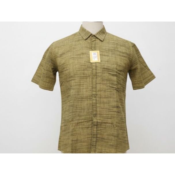 This shirt displays a distinct, textured fabric resembling raw silk or slub cotton in an earthy khaki/olive hue, detailed with fine horizontal dark brown lines. It features short sleeves, a structured spread collar, and a full button placket. The fit appears contemporary and smart. Available at Gangavathiexports with exceptional quality and unbeatable pricing.