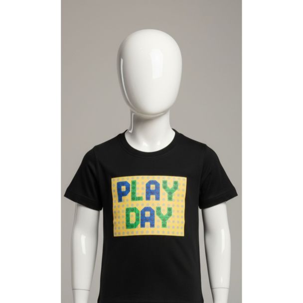 - Graphic Print: "PLAY DAY" in bold blue and green letters, set against a bright yellow background with a pixelated texture, mimicking building blocks.