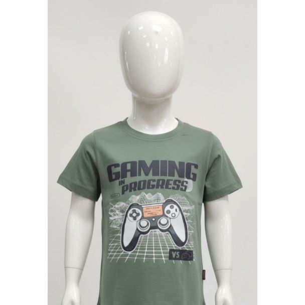 Kids Gaming Print Cotton T-Shirt Olive Green Short Sleeve