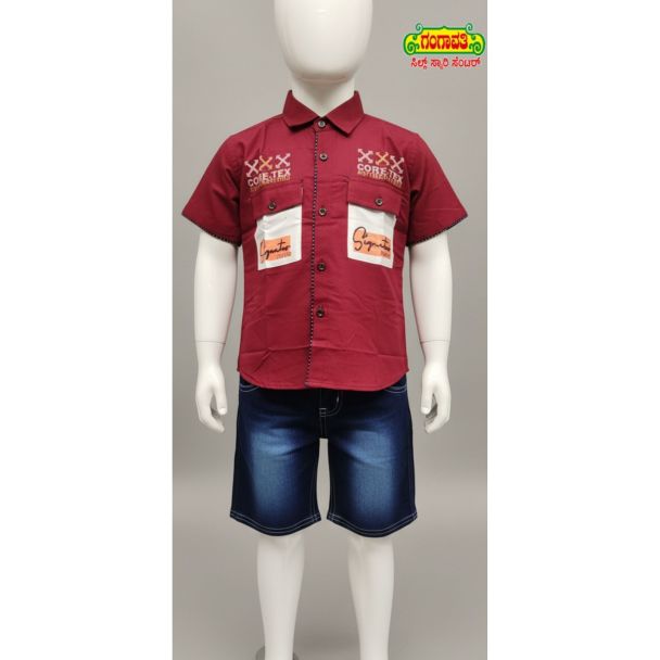 This charming kids' set is designed for comfort and style. Perfect for everyday wear, this ensemble includes a maroon cotton shirt and matching denim shorts. This budget-friendly outfit is ideal for active kids, offering a classic look with a touch of modern flair. It's an easy choice for parents looking for practical and fashionable clothing options for their children.
