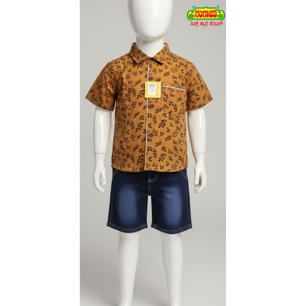 Order Now: Add a touch of style to your child's wardrobe with this adorable shirt and shorts set! Its budget-friendly price makes it an excellent value for money. Available now at competitive prices, this set is made from high-quality materials to ensure comfort and durability. Order this Kid's Mustard Floral Cotton Shirt and Denim Shorts Set from Gangavathi Exports, Davangere, and give your little one the gift of stylish comfort.
