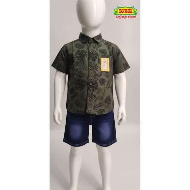 Order Now: Elevate your child's wardrobe with this stylish and affordable set. Experience quality and design without breaking the bank. Shop this Olive Green Floral Print Shirt and Denim Shorts set, crafted with care and designed for all-day comfort, from Gangavathi Exports, Davangere