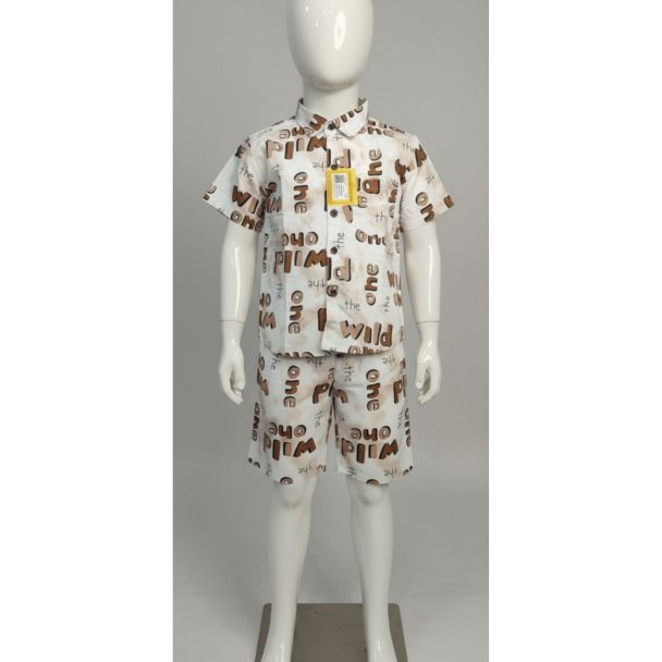 Kids White Brown Print Short Sleeve Shirt Shorts Set