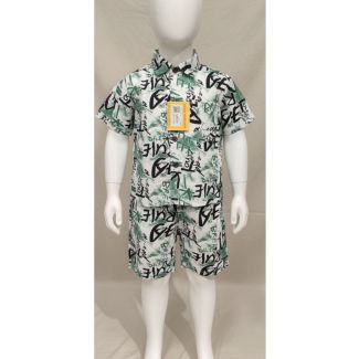 2. White, green, and black graffiti print cotton shirt and shorts set for kids on a mannequin