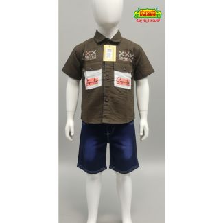 2. Boys brown cotton shirt with blue denim shorts set - Casual Wear