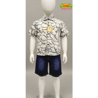 1. Boys white abstract printed cotton shirt with dark blue denim shorts set