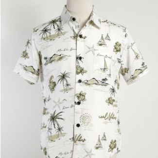 2. White short sleeve button-up shirt with tropical print featuring palm trees and boats.
