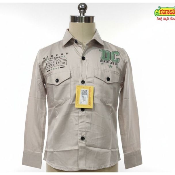 This smooth cotton blend shirt in light beige features bold graphic prints in black, gray, and olive green on the chest. It has a classic collar, full sleeves with buttoned cuffs, and a full button-down front with black buttons. Two buttoned patch pockets adorn the chest, enhancing its regular fit silhouette. Available at Gangavathiexports with exceptional quality and unbeatable pricing.