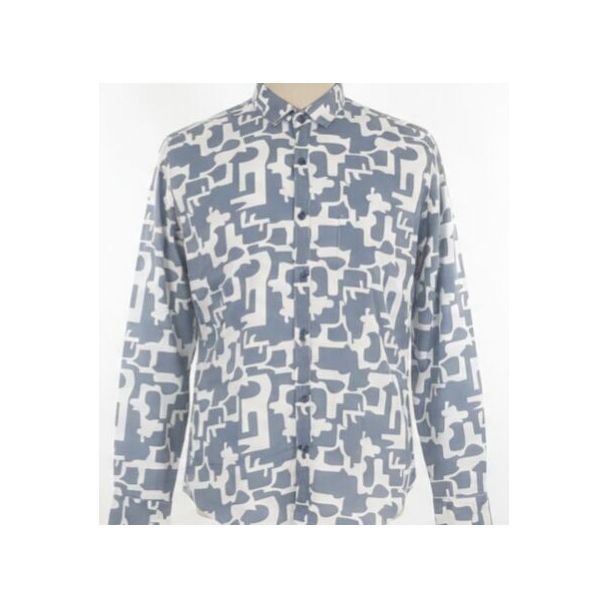 This light blue shirt features a white geometric print, long sleeves, a button-down front, and a classic collar.