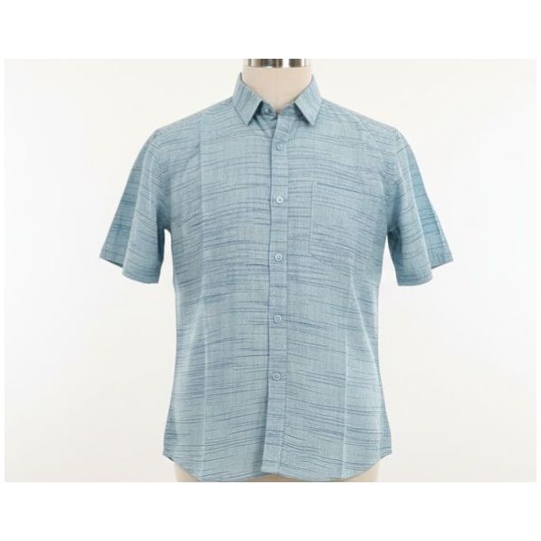 This light blue shirt exhibits a textured slub fabric with fine, horizontal dark blue stitch-like stripes. It features a standard collar, short sleeves, and a full button-down placket with a single chest pocket. The fit appears tailored for a casual, crisp look. Available at Gangavathiexports with exceptional quality and unbeatable pricing.